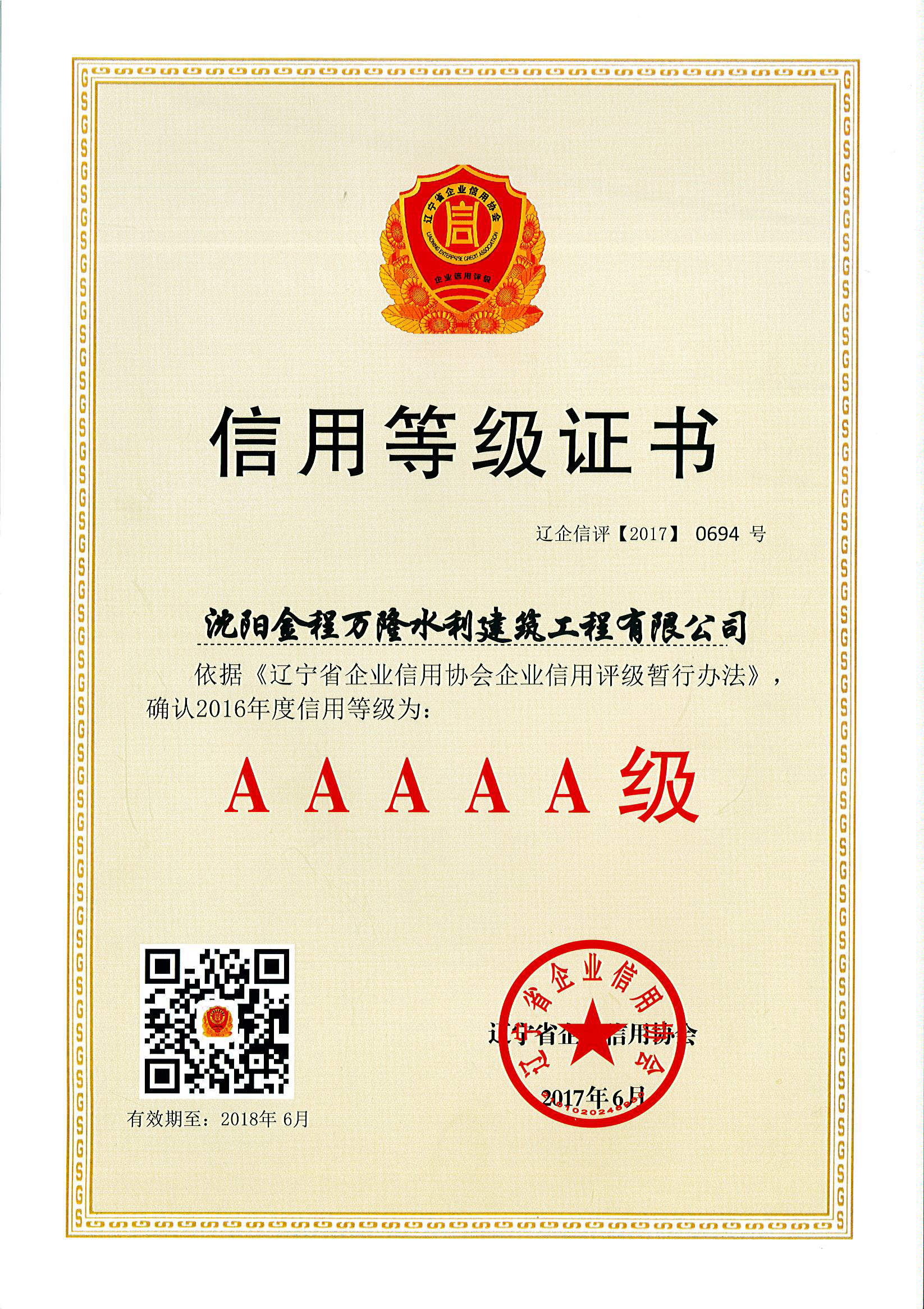 2016年度省5A級“信用等級證書”